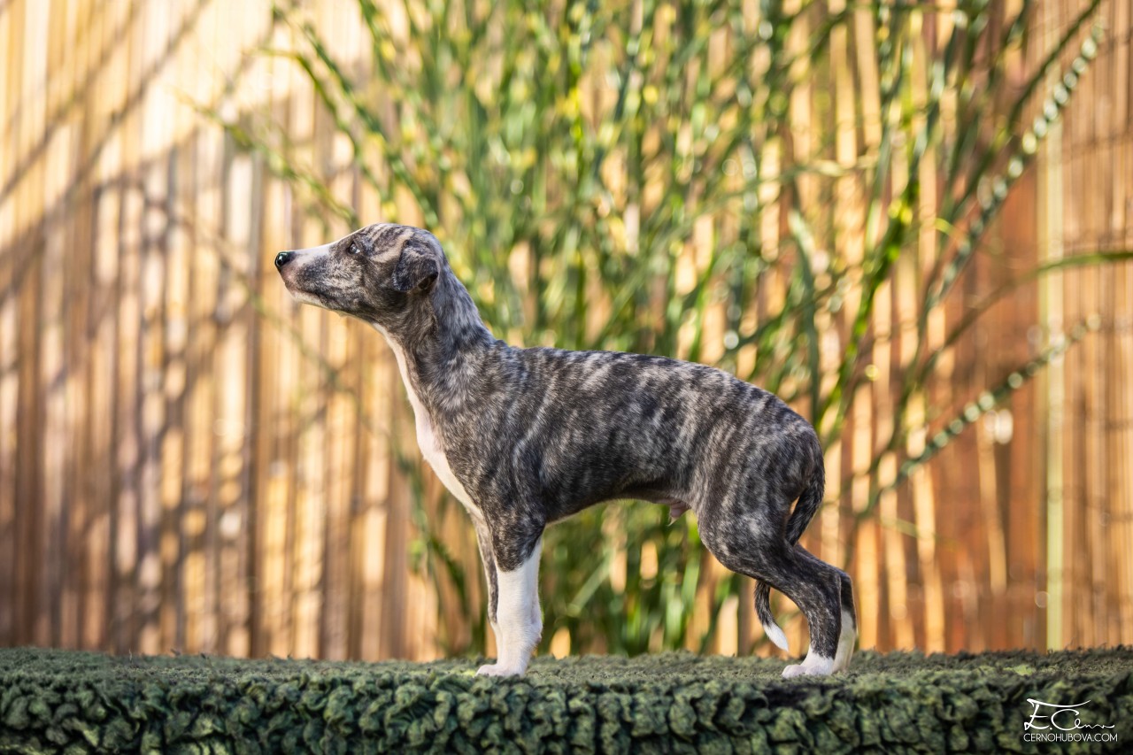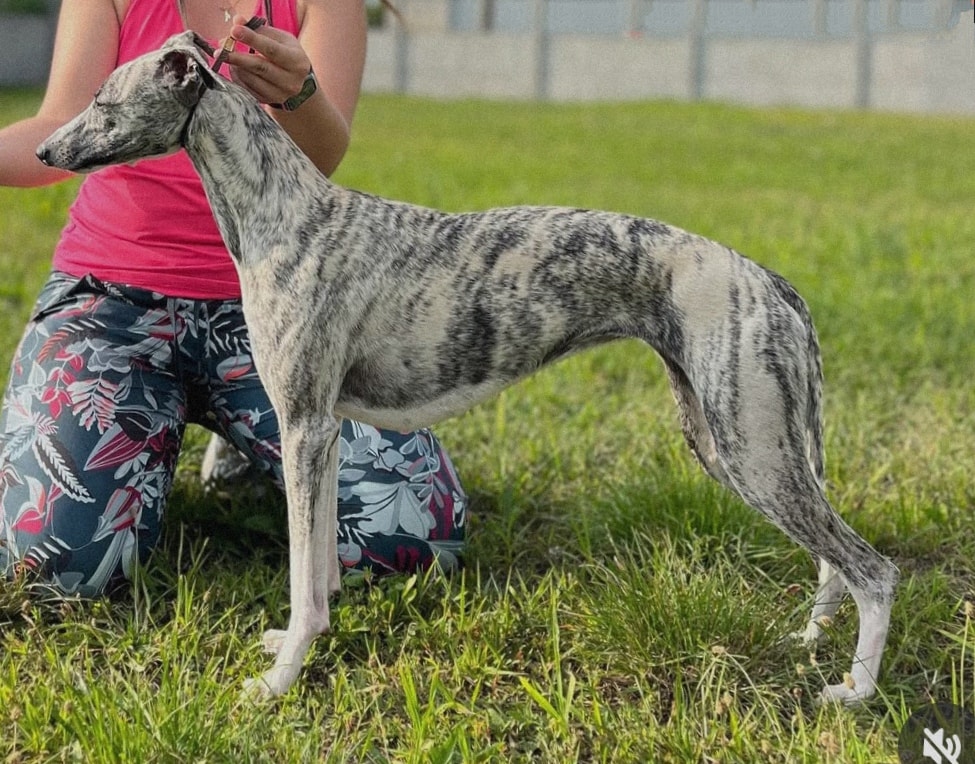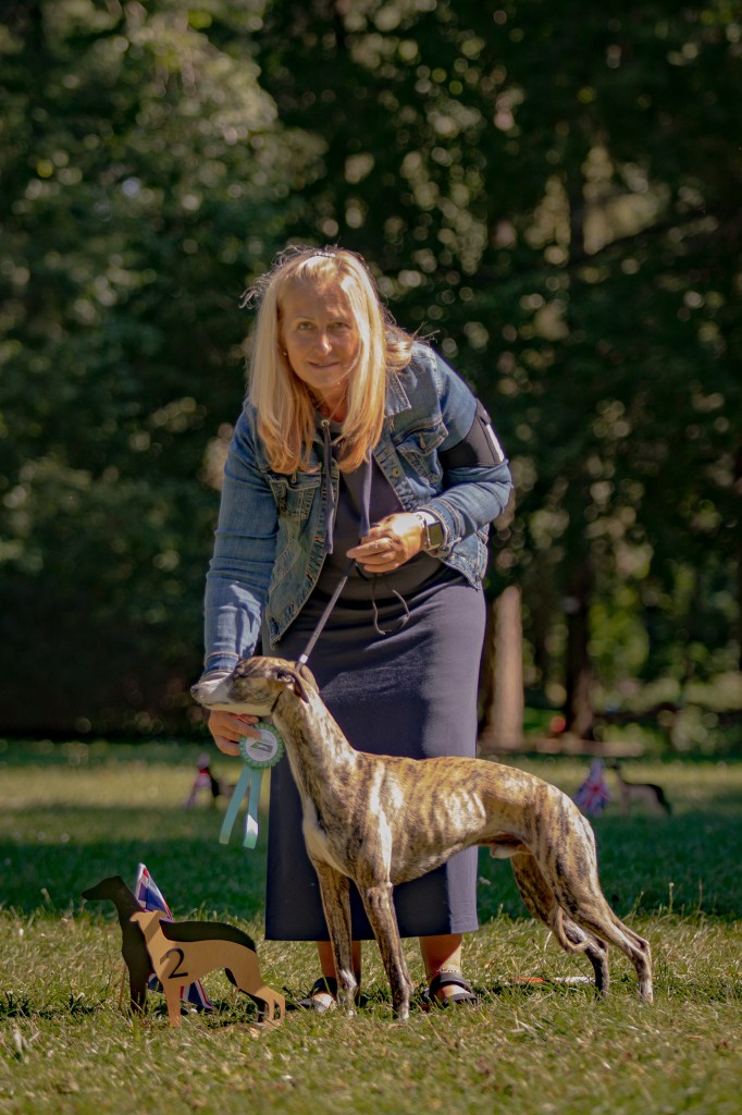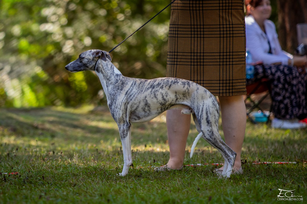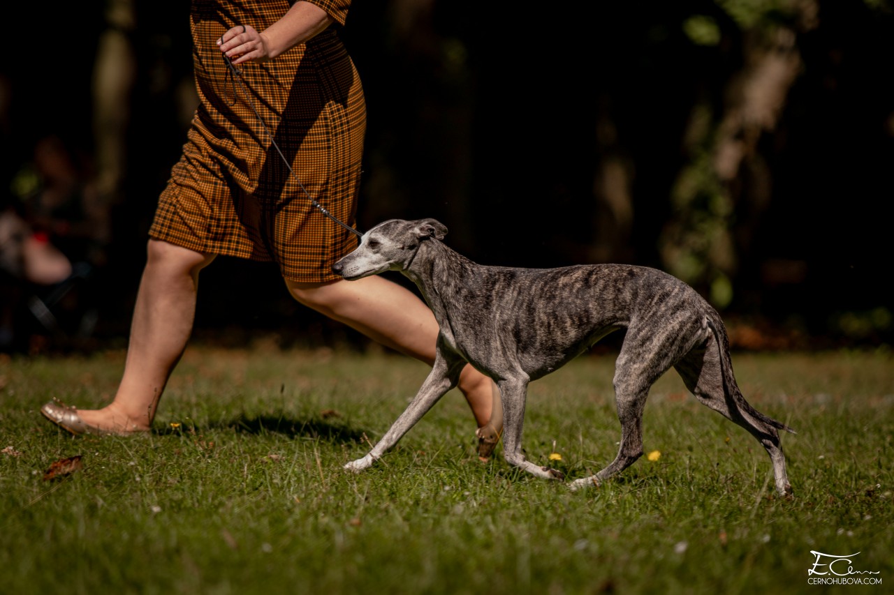 posudek: 11,5 years old, beautifully made, beautifully kept whippet lady, Beautiful head and expression, well carried ears, Lovely neck, well placedshoulders, Very good topline and underline, Balanced angulation. Nothing overdone. Excellent pasterns and feet. Moves very well from all direction, kuuping her lines. Moves like a much younger dog. A credit to her owner. Lovely distinguished temperament.